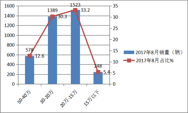 3、2017年8月15万以下的价格区间销量占比减少,主要是因为2017年8月3.5-5米之间的校车市场减少,因此拉高了在这一区间的价格。