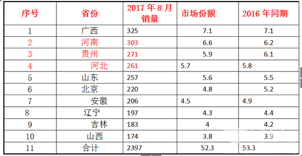 6、与2016年8月比较,2017年8月校车销售主要集中在15-40万区间的比例几乎相当,而销量比例在两头的价格区间中高端增加,低端减少的趋势较为明显,这给校车的市场价格定位以启示。