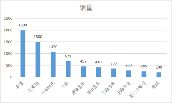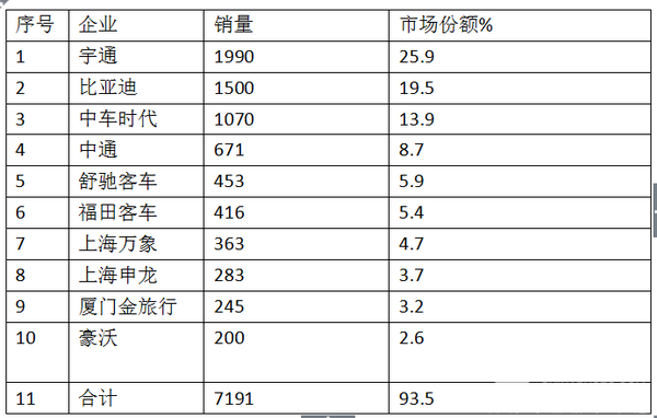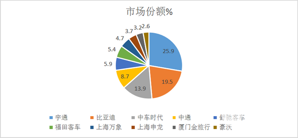 2、宇通客车以1990辆的销量占据新能源公交客车老大的地位,其市场占有率达到25.9%,超过了四分之一,比第二名的比亚迪高出6.4个百分点,说明其老大地位比较稳固。