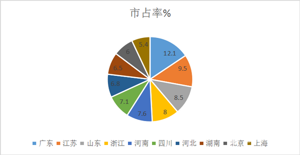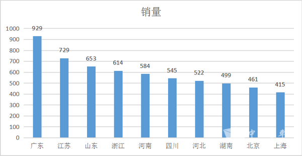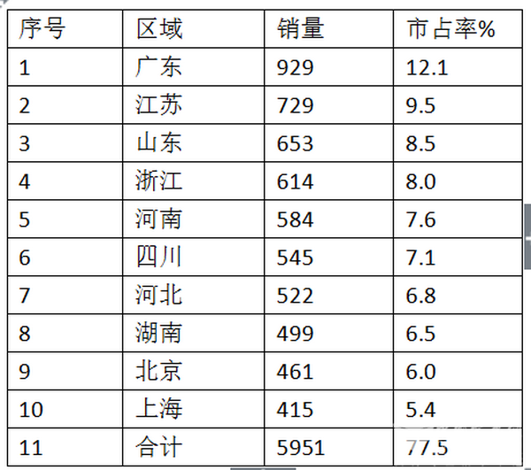 2、前10名销量区域销量总计为5951辆,市场占有份额达到77.5%,可见垄断程度较高。