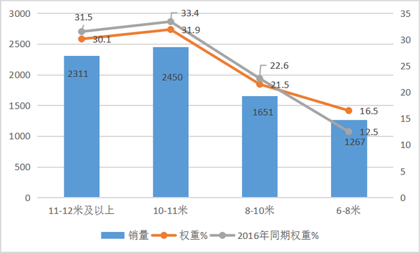 3、8-10米及10-11米、11-12米段同比权重都有不同程度的下降。