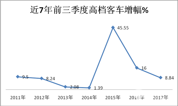 1、2017年前三季度90万以上高档客车销量同比2016年增加8.84%,增幅比2016年、2015年同期均明显收缩。。