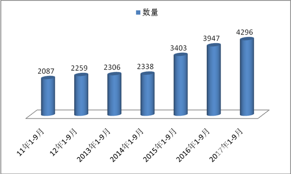 2、按价格区间划分统计2013年1-9月至2017年1-9月近5年高档豪华客车销售数据(表4),单位:辆