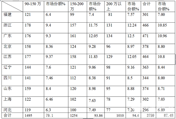 3、从价格细分市场来看,浙江市场是90-150万价格销量最大的区域,其次是江苏,再次是广东;同时广东还是150-200万销量最大的区域,其次是江苏,再次是浙江。广东仍然是200万以上客车销量最大的区域,其次是浙江,再次是江苏。可见。价格细分区间销量与总销量的规律分布稍有差异。