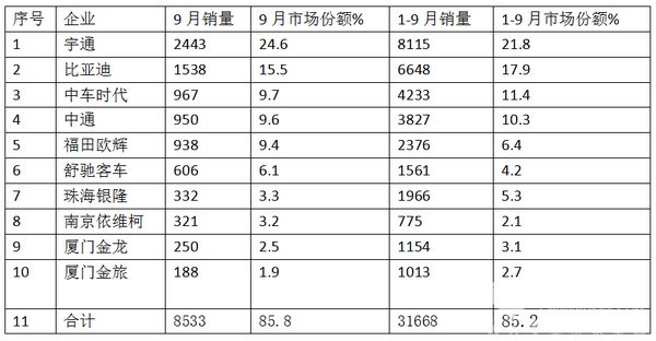 1、2017年9月及1-9月重点客车企业新能源公交客车销量及市场份额如下表: