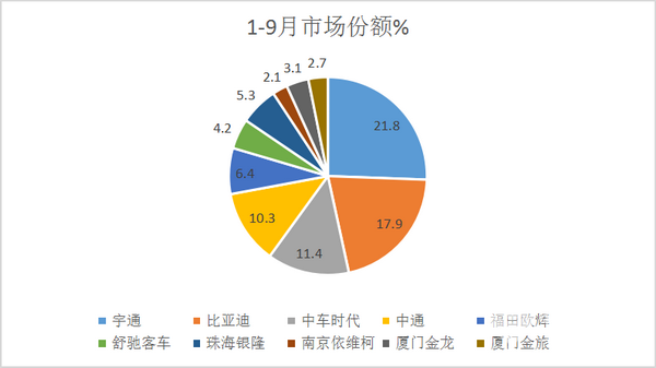 2、宇通客车分别以2443辆和8115辆的销量占据9月及1-9月新能源公交客车老大的地位,其市场占有率分别达到24.6%,和21.8%,比第二名的比亚迪分别高出近9个百分点和4个百分点,说明其老大地位比较稳固。