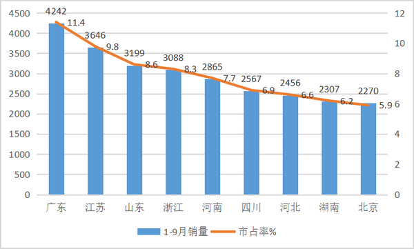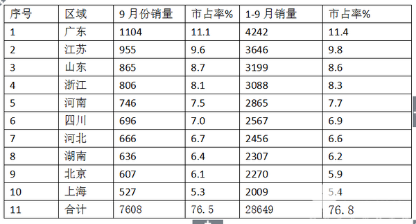 2、9月及1-9月前10名销量区域销量总计分别为7608辆和28649辆,市场占有份额达到76.5%和76.8%,可见垄断程度较高。