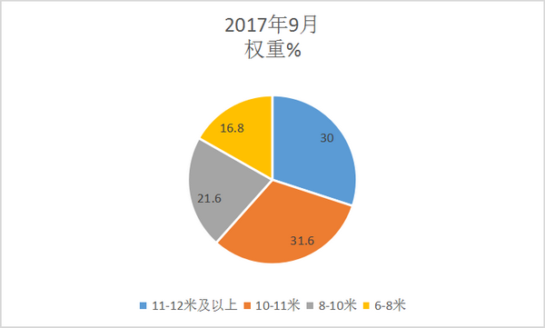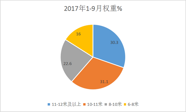 三、10米以上大型客车是新能源公交客车的销量主体,6-8米权重同比有所加大----2017年9月及1-9月新能源公交客车按长度划分销量结构分析