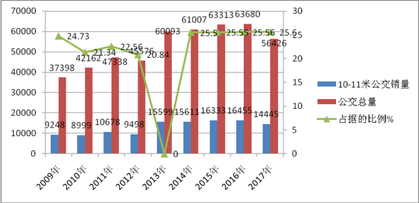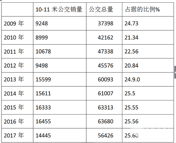 根据近7年的上牌数据统计,近8年1-9月10-11米公交占据公交总量的比例大致如下: