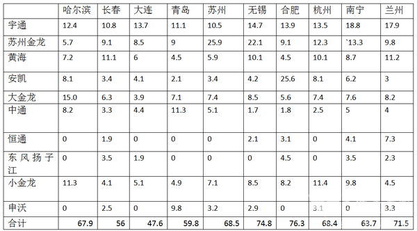 1.哈尔滨、大连、长春、青岛、无锡、苏州、合肥、杭州、南宁、兰州等十二线大城市的10-11米公交占据10-11米公交总量的8-11.4%之间。2012年最大为11.4%,2013年最小为8.10%,说明了十大二线城市的10-11米公交采购量每年都占据市场总体需求的10%左右,可谓举足轻重。