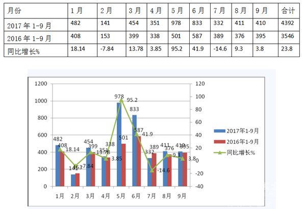 根据上牌数据统计,2017年1-9月各月LNG客车销量及2016年同比情况表