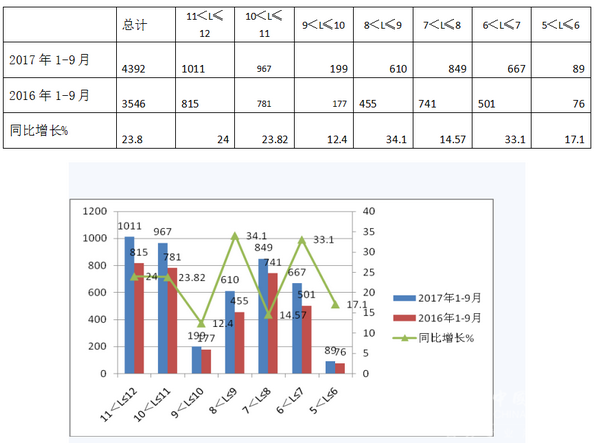 根据国家车管部门的上牌数据,2017年1~9月,5米以上LNG客车共计销售4392辆,比2016年同期的3546辆多846辆,增幅幅为23.8%,按长度段划分销量结构如下: