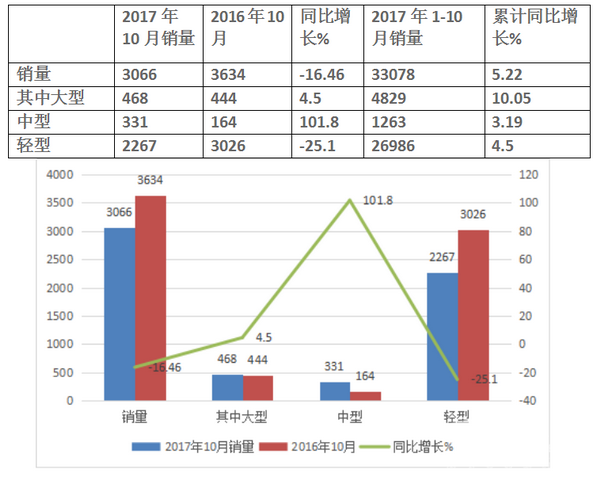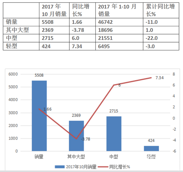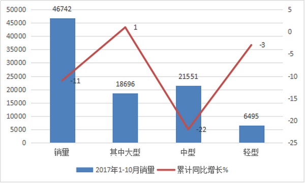中型车方面,2017年10月,中通中型车产销量分别为559辆和481辆,同比分别下降37.89%和39.8%;1-10月,中通中型车累计产销量分别为3479辆和3359辆,较去年同期分别下降38.92%和36.03%.
