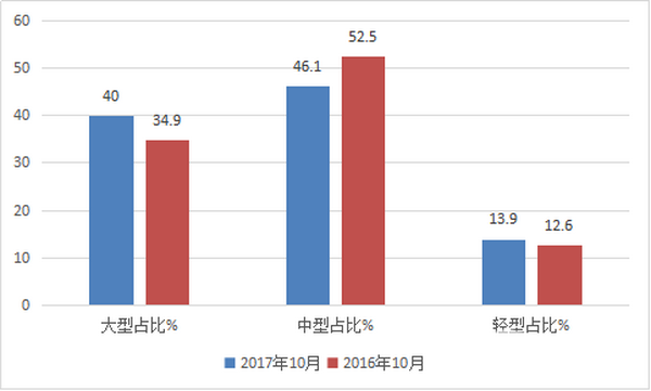 从10月销量占比看,中型客车占比49.91%,占据了总销量的半壁江山,其次是轻型客车占据29.42%的权重,再次是大型客车占据20.67%的权重。
