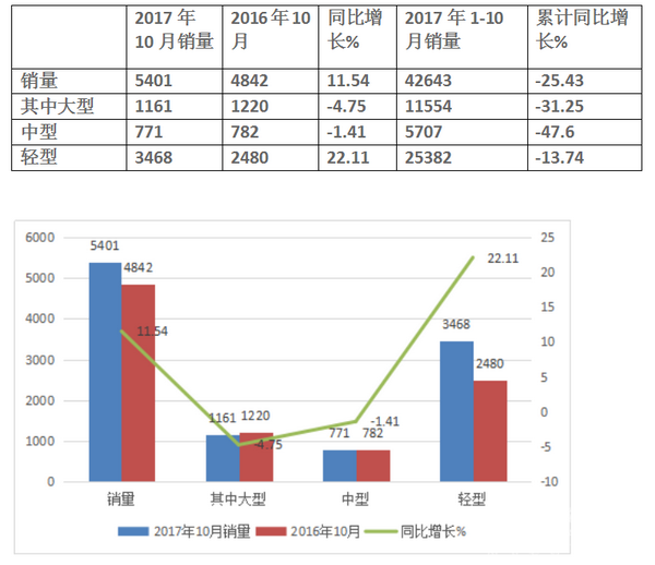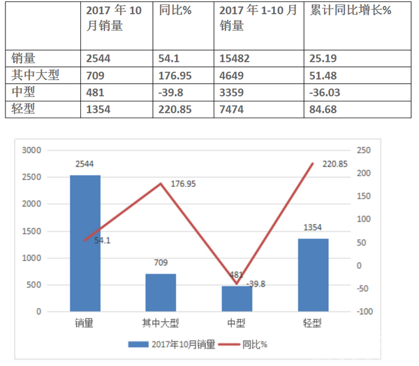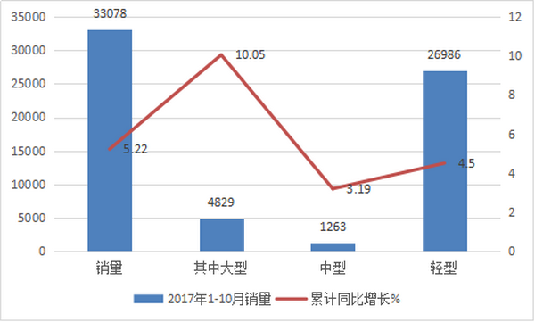 轻型车(包括物流车)方面,2017年10月,中通轻型车产销量分别为1243辆和1354辆,同比出现飞跃式的增长,分别为184.44%和220.85%;1-10月,中通小型车累计产销量分别为7779辆和7474辆,较去年同期分别增长85.97%和84.68%。