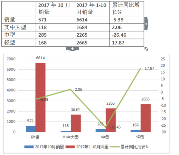 2、细分车型来看,2017年10月,中通大型车产销量分别为659辆和709辆,同比出现大幅度增长,分别为153.46%和176.95%;1-10月大型车累计产销量分别为5077辆和4649辆,较去年同期分别增长64.46%和51.48%。