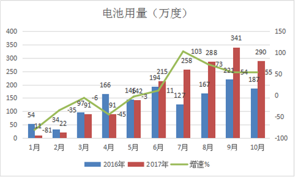 上图表数据表明,2017年1-10月新能源汽车电池用量从6月份开始同比转为正增长,其中增长最大的月份是7月份。10月电池用电量增加55%,在1-10月中增幅第三。