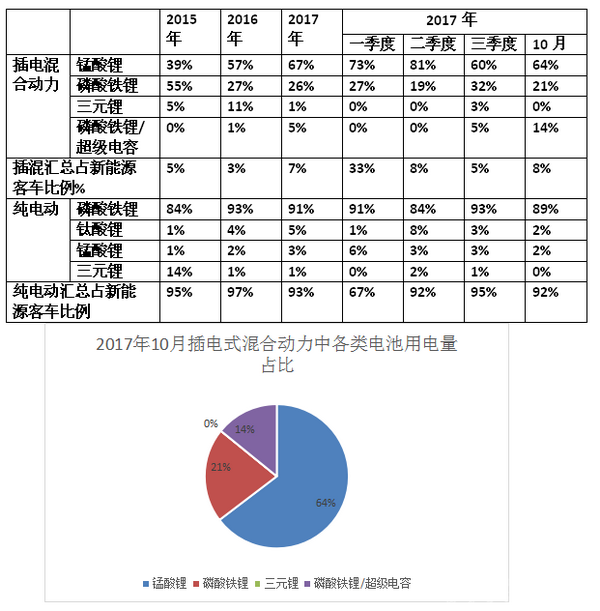 3、2017年10月新能源客车市场的插电式混合动力客车中,锰酸锂电池用电量占据了64%,磷酸铁锂电池用电量占据了21%的权重,酸铁锂电池/超级电容占据14%的权重,三元锂电池用量为0%。