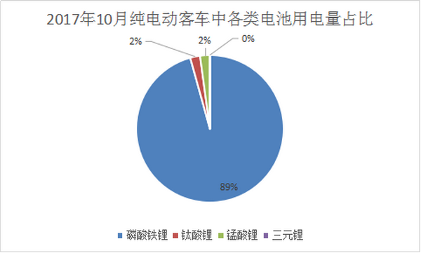2、2017年10月新能源客车市场的纯电动客车中,磷酸铁锂电池用电量占据了89%的权重,钛酸锂和锰酸锂各占2%的权重,而三元锂电池用量为0%。