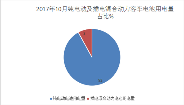 1、2017年10月新能源客车市场中,插电式混合动力电池用电量占据了8%的权重,纯电动客车电池用电量占据了92%的电池用电量。显而易见,纯电动客车电池用电量占据了绝对的市场份额。