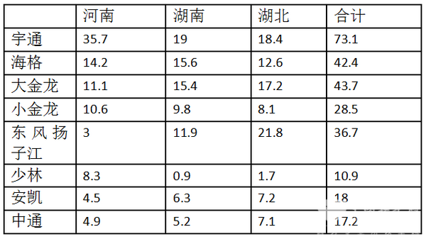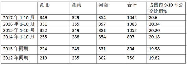 2、湖北、湖南等区域与河南市场存在类似情况,只不过人口和中小城市规模、数量都没有河南那么密集,因此,9-10米公交市场必然要小于河南区域。