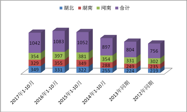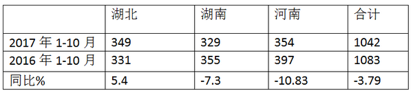 2、2017年1-10月,湖北、湖南、河南三个区域市场中,河南销量最大,其次是湖北,最小的是湖南市场,2017年1-10月同比增长最大的是湖北,降幅最大的是河南,可见华中各区域市场增长不平衡,有增长,也有下降