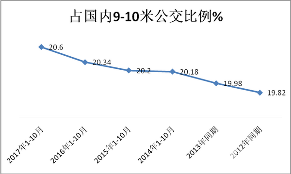 1、华中区域9-10米公交的销量占据全国9-10米公交增量的比例近5年1-10月正在逐年提高。由2012年的19.82%逐年提高到2017年的20.6%,可见华中区域各省的9-10米公交的权重越来越大。