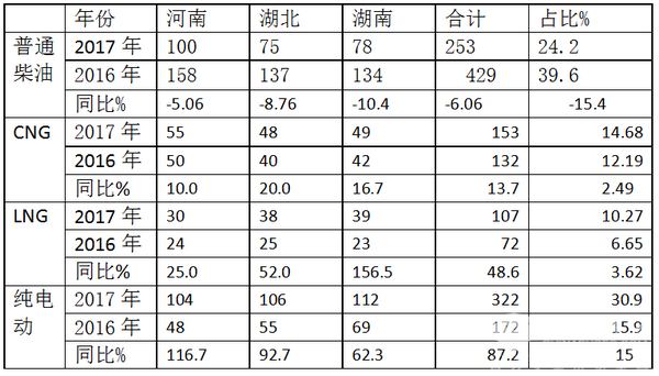 2017年1-10月华中地区按动力种类划分9-10米公交销量统计表(来自上牌数据)