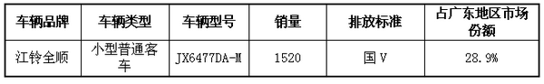 2017年1-10月,广东地区江铃全顺JX6477DA-M轻型客车共销售1220辆,占江铃汽车有限公司2017年1-10月广东地区总销量的28.9%。,而2016年同期为30%,降低了近1个百分点,说明这一单款产品市场集中度在下降。