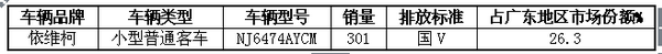 2017年1-10月,广东地区南京依维柯NJ6474AYCM轻型客车共销售301辆,占该汽车企业2017年1-10月广东地区总销量的26.3%,而2016年同期市场占有率为37.4%,说明南京依维柯此款产品在广东区域市场下降了11个百分点。