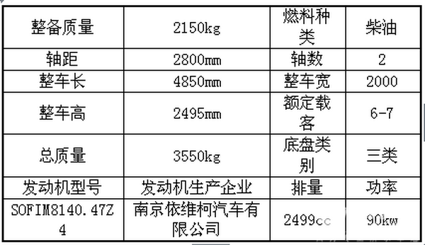 从主要技术参数来看,南京依维柯NJ6474AYCM轻型客车配备的发动机为发动机选用南京汽车集团有限公司生产的SOFIM8140.47Z4发动机,发动机排量为2499CC,发动机功率为90千瓦,整车总质量3550千克,整备质量2150千克,最高车速可达130公里/小时,可载客6-9人。