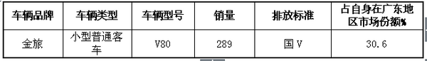 2017年1-10月,广东地区上汽大通轻型客车共销售944辆,占2017年1-10月广东地区总销量的6.15%,其中而2017年前10月销量最大的车型是V80(敖运通),共计销售289辆,占据该企业在广东区域轻客销量的30.6%。