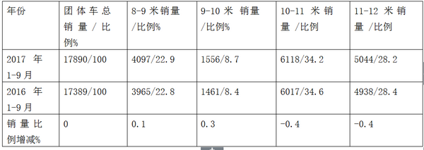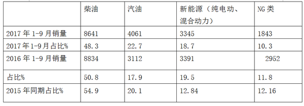 下表是按动力种类划分对2017年1-9月团体客车销量及占比分析
