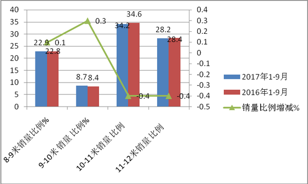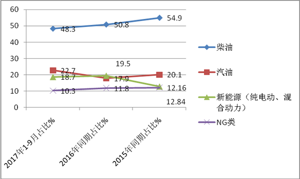 上图表数据表明,2017年前三季度,新能源客车权重增加的幅度最大,说明新能源客车已经逐步向团体客车市场渗透。