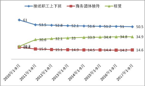 1、近7年1-9月以来,接送职工上下班始终是团体车最大的目标市场,占据团体客车总销量的比例至少在50%以上。但近年来,接送职工上下班的团体车比例在逐年下降,从2010年的61%逐年下降到2017年的50.5%,下降趋势较明显。