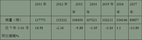 2、、2016、2015、2014年、2013年、2012年、2011年很多客运公司都提前花完了2017年对公路客车的购买指标,透支情况比较普遍,因此势必影响2017年1-10月的公路客车市场。