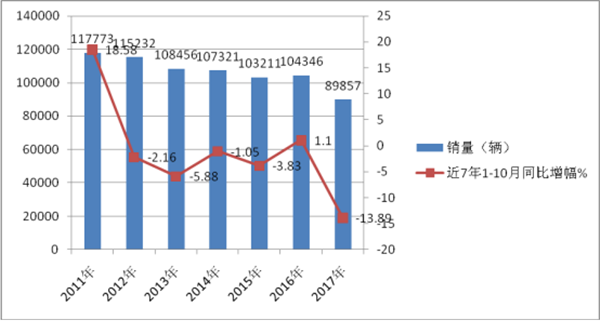 根据最新车管部门上牌资料,2017年 1-10月5米以上公路客车共销89857辆,大约占客车销量的50%左右,同比下降13.89%,近7年1-10月公路客车销量及同比增幅%(以下数据均来自近年上牌数据统计)。