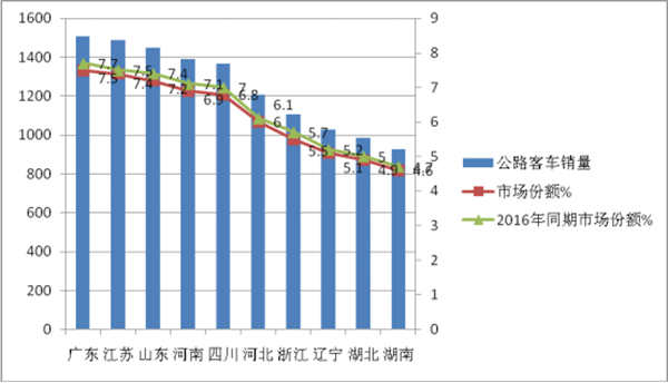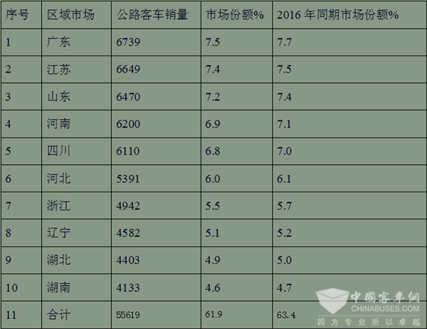 根据上牌数据统计,6米以上公路客车主要分布在广东、江苏、山东、河南、四川、河北、浙江、辽宁、湖北和湖南等十大区域市场,根据市场调研,这十大主流市场的公路客车历来占据全国的市场份额都在60%以上,。根据上牌数据统计,十大区域2017年1-10月5米以上公路客车共计销售55619辆,其中产品销量及市场份额在前10名的全国主流区域市场列表如下:
