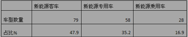 根据统计,第11批新能源汽车推荐目录中,新能源客车车型为79款,占比为47.9%;新能源专用车有58款,占比为35.2%;新能源乘用车有28款,占比为16.9%。