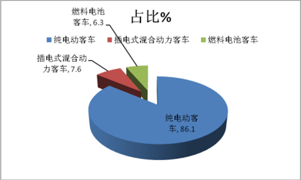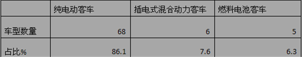 根据统计,在第11批新能源汽车推荐目录的79款新能源客车中,纯电动客车有68款,占比为86.1%;插电混合动力客车6款,占比为7.6%;另有5款燃料电池客车,占比为6.3%。