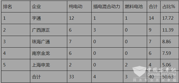 特征三:新能源客车老大宇通是第11批新能源客车推荐目录中上榜车型中最多的企业,前5名上榜车型数量占比为50.63%。超过此次推荐新能源客车车型数量的半壁江山。
