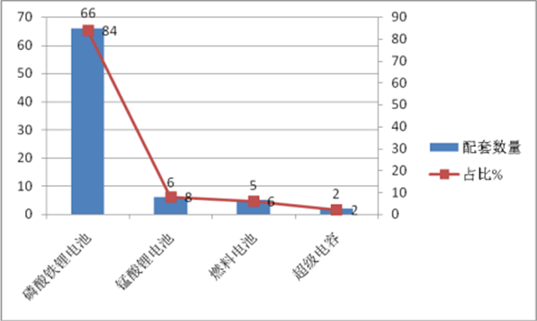 从配套电池类型方面来看,79款客车产品中,有66款产品搭载磷酸铁锂电池(个别产品搭载两种类型电池,笔者将其分开统计),占比84%;有6款产品搭载锰酸锂电池,占比8%;搭载燃料电池的产品有5款;搭载超级电容的产品有2款.