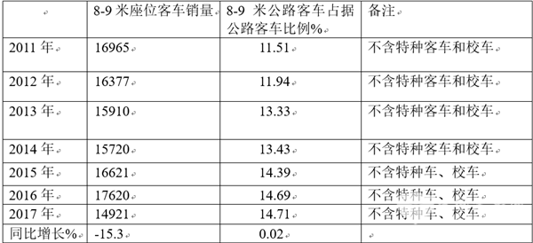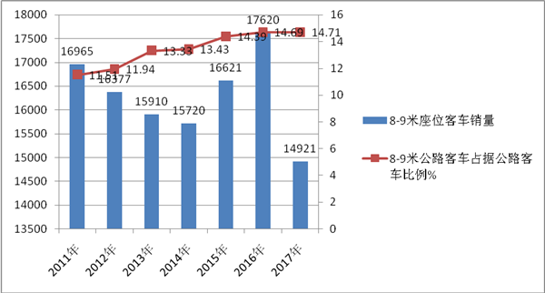 根据车管部门的上牌数据显示,2017年1-11月8-9米公路客车(不含校车、特种客车)销售14921辆,同比下降15.3%,占据公路客车总体市场的份额比2016年同期提高了近0.02个百分点。