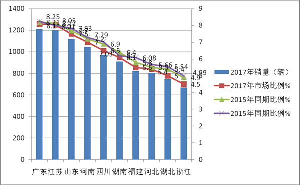2、8-9米公路客车市场流向分布不均衡,广东、江苏、山东、河南、等经济强省(或者人口大省)的市场份额均超过7%,但同比前2年同期均相应有所下降。