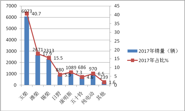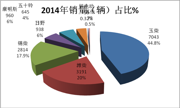 2、进口(或合资)品牌中,康明斯比例最大,其次是日野,再次是五十铃,但同比有升,总体趋于持上升态势。