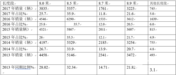 1、 根据市场调研可知:在8-9米座位车中,以2017年前11月8米5左右的国产中型高一级车销量为最大(从上面分析可知约占8-9米公路客车销量的三分之一),以此长度段的车型来说明8-9米公路客车的主要配置情况和具有一定的代表性,表6