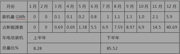 特征二、纯电动各月电池装机量分布不均衡,下半年明显大于上半年;其中12月电池装机量最大,单月占全年比为40.7%,可谓鹤立鸡群,单月独大;其次是11月,“抢装效应”再现