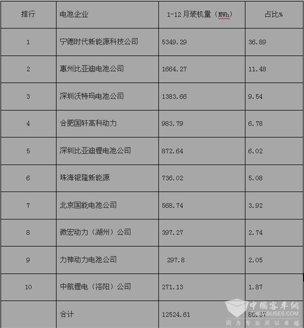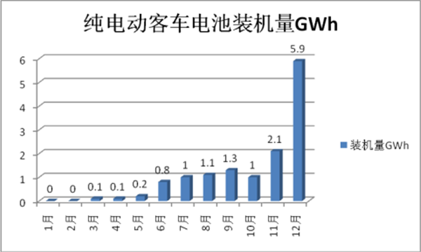 2017年1-12月各月纯电动客车电池装机量数据统计表