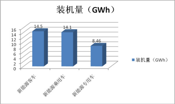 上图表显示,2017年新能源汽车动力电池装机量为37.06GWh。其中,纯电动客车动力电池装机量为14.5GWh,占比39%,新能源乘用车装机量为14.1 GWh.占比为38%,新嫩挂机专用车装机量为8.46 GWh,占比为22.9%,新能源客车占比以微弱优势领先于乘用车市场装机量。