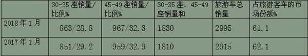 1)2018年1月,在销售的旅游客车2995辆中,30-35座的销售了863辆,45-49座的销售了967辆,两者之和为1830辆,占旅游客车总销量的比例为61.1%;其中30-35座占有的比例为28.8%,45-49座占据的比例为32.3%。 2)2018年1月,30-35座与45-49座的销量之和占据今年旅游客车总销量的比例要低出2016年同期近1.0个百分点,说明旅游车向这两个长度段集中的倾向有所减弱。
